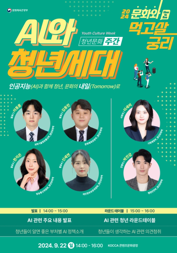 먼저, 4개 부처 청년보좌역들이 ‘인공지능(AI)과 함께 청년, 문화의 내일(tomorrow)로’를 주제로 부처별 주요 인공지능(AI) 정책을 설명했다. 이어 청년보좌역들과 2030청년들은 인공지능(AI) 시대와 관련해 자유롭게 의견을 나눴다.