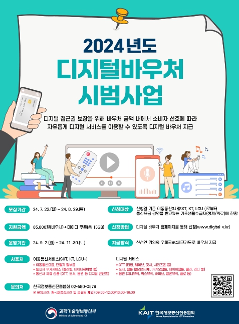 디지털 이용권(바우처) 시범사업은 기존에 통신요금 감면을 받고 있는 기초생활수급자(생계·의료급여)를 대상으로 참여자를 모집하여, 오는 9월부터 11월까지 3개월 동안 진행된다.