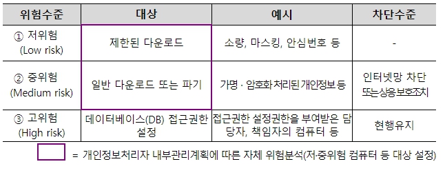 개인정보처리자는 내부관리계획에 따라 위험분석을 거쳐 위험수준을 구분해 저위험·중위험 컴퓨터 등에 대하여 인터넷망 차단조치 이외에 이와 상응하는 보호조치 하에서 제한된 인터넷망 접속도 허용하도록 완화할 방침이다.