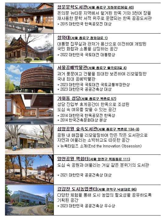 특히, 올 가을 예정인 대한민국 공공건축상 등 건축문화 행사와 연계하여 추가로 실시한다.