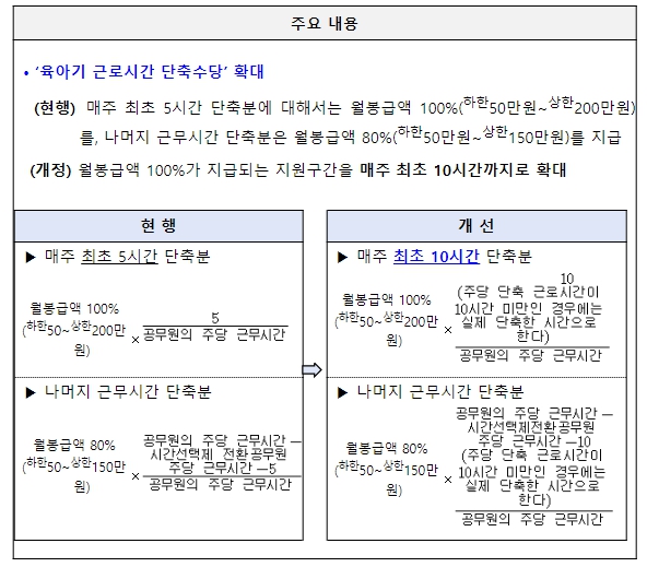 육아를 위해 근로시간을 단축한 공무원의 소득보전을 위해 지급하는 육아기 근로시간 단축수당의 봉급 100% 지원구간을 주당 최초 5시간에서 최초 10시간으로 확대한다.