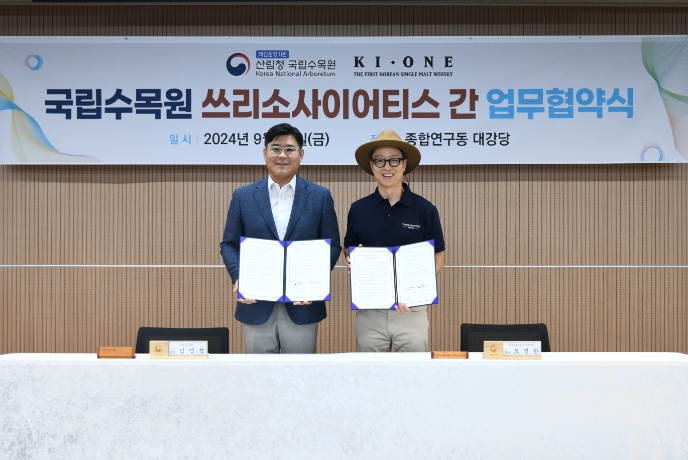이번 협약은 국립수목원의 정부혁신 어벤져스팀이 제안한 ‘산림부산물을 활용한 고부가가치 제품 생산을 위한 민관협력’ 아이디어에서 출발했다. 우리의 자원인 산림식물 유래 부산물을 활용하여 새로운 제품을 개발하고 지역 경제에도 기여할 수 있는 방안을 모색하던 중 남양주에 소재한 한국 최초 싱글몰트 기원 위스키를 생산하는 증류소 ㈜쓰리소사이어티스와 손을 맞잡게 된 것이다. 양 기관은 현재 주목, 노각나무, 무궁화 등 산림식물의 부산물을 활용한 제품을 개발중이다. 이로서 더스킨팩토리 쿤달과의 ‘향기정원 조성’, ㈜더네이쳐홀딩스와의 에코티어링 프로그램 ‘키즈탐험대’ 운영과 같은 실질적인 민관 협력사례를 한 건 더 추가하게 됐다.