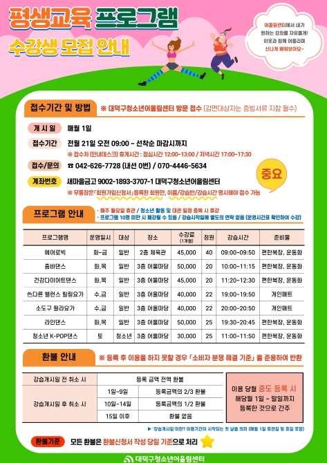 허숭운 대덕구청소년어울림센터장은 “지역민의 수요를 반영해 다채로운 강좌를 준비했으니 많은 관심과 참여를 부탁드린다”라고 전했다.