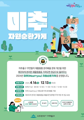 미추 자원순환가게는 미추홀구 관내 23개 주요 거점에서 동별 운영의 효율성을 고려해 매주 2회, 하루 4시간씩 운영되며, 자세한 사항은 구청 누리집에서 확인할 수 있다.