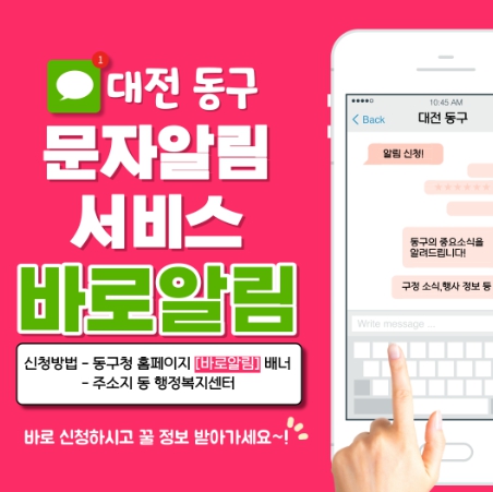 [뉴스서울] 대전 동구는 사회관계망(SNS) 사용에 익숙지 않은 구민들도 손쉽게 구정소식을 제공받을 수 있도록, 매월 2회 주요 구정소식과 지역정보 등을 문자로 발송해 주는 구정소식 문자서비스 ‘바로알림’을 시행한다고 18일 밝혔다.