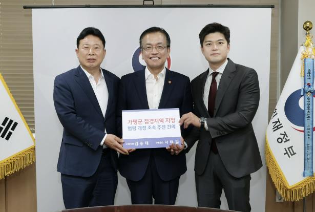 | ▲ 서태원 가평군수는 김용태 국회의원과 함께 9일 기획재정부를 방문, 가평군의 접경지역 지정에 대해 적극적인 협조를 요청했다. 사진 왼쪽부터 서태원 군수, 최상목 기획재정부장관, 김용태 의원. |