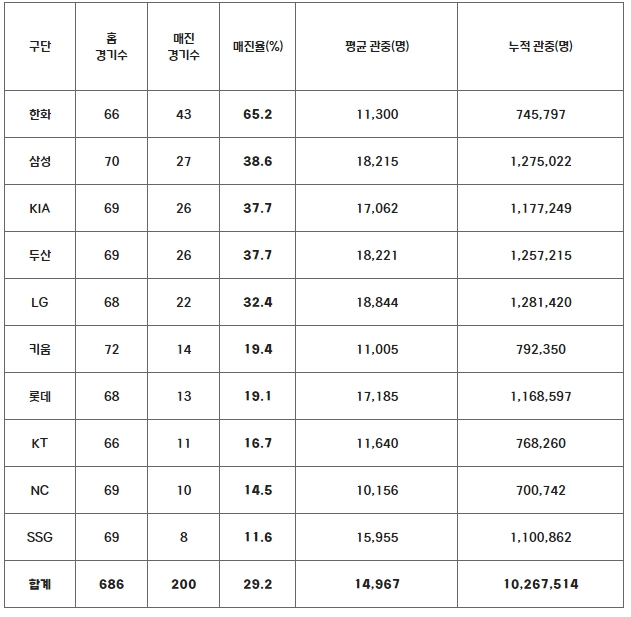 구단 별로는 한화가 전체 홈 경기의 65.2%인 43경기를 가득 채우며 가장 많은 매진 경기를 만들어냈다.