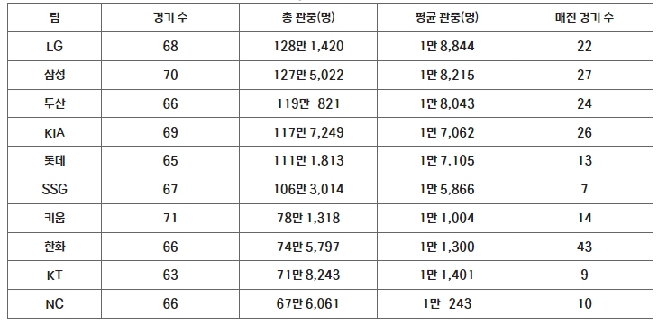 ▲ 평균 관중 1만 4,934명… LG, 삼성, 두산 1만 8,000명 이상 평균 관중