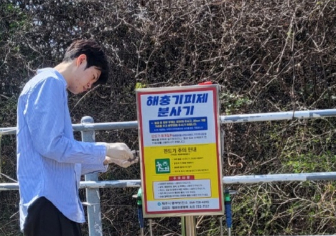 동부보건소에서는 관할 동부지역 오름 진입로에 진드기 기피제 분사기 설치하여 주민들의 감염병 예방에 주력하고 있다.