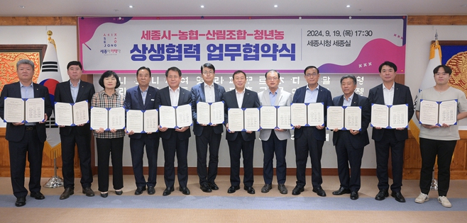 [뉴스서울] 세종특별자치시가 19일 시청 세종실에서 농림업 분야 주요 기관 및 청년 농업인과 업무협약을 맺고 적극적인 시정 참여·협력을 통해 농촌지역의 지속가능한 발전에 힘을 모으기로 했다.