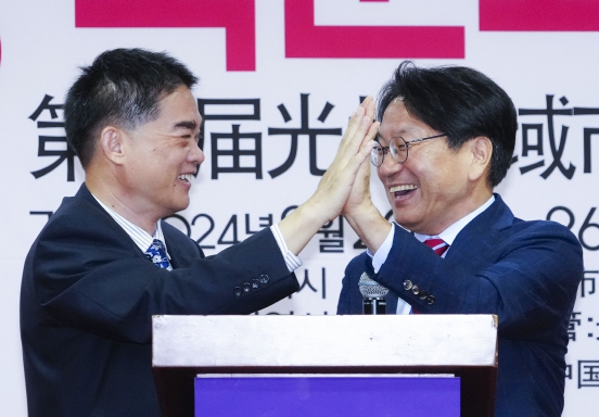 ▲ 강기정 광주광역시장(오른쪽)이 20일 오후 서구 광주차이나센터에서 열린 '제10회 중국문화주간 개막식'에 참석해 꾸징치 주 광주 중국총영사(왼쪽)와 개막선포를 하며 하이파이브 하고 있다./광주광역시 제공 |