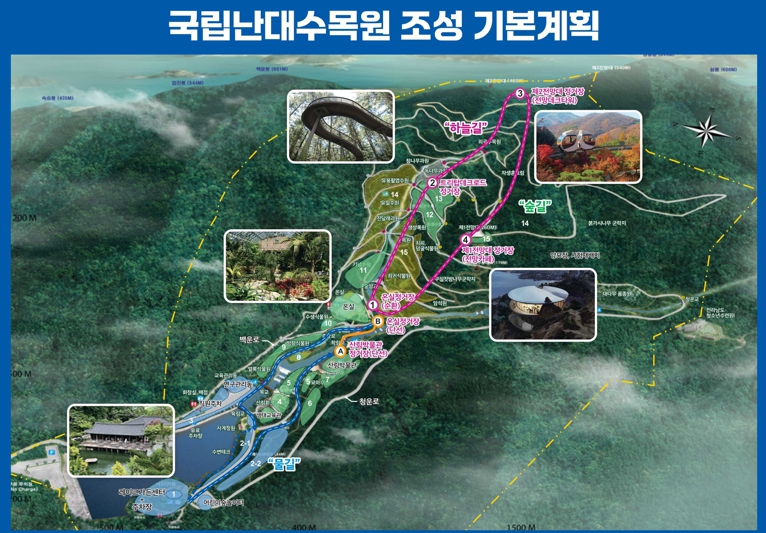 이에 따라 확정된 기본계획은 난대숲의 지속가능한 가치 창출을 선도하는 세계적 수목원 조성을 목표로 5대 랜드마크인 ‘하늘길 모노레일, 레이크가든, 다도해 전망대, 전시온실, 트리탑데크로드’를 조성한다는 내용을 담았다.