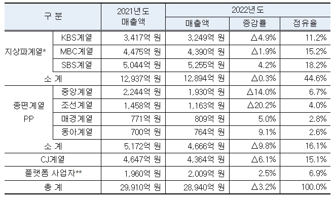 방송광고시장 규모의 감소는 사회적 거리두기 해제로 인한 방송 시청시간 감소, 콘텐츠 소비 행태 변화 등이 영향을 미쳤을 것으로 분석됐다. 사업자군 별로는 지상파방송 3사(계열PP 포함)의 방송광고 매출액이 1조 2,894억 원으로 전년 대비 0.3% 감소했고, 종편계열PP는 4,666억 원으로 전년 대비 9.8% 감소, CJ계열PP는 4,364억 원으로 6.1% 감소했다.