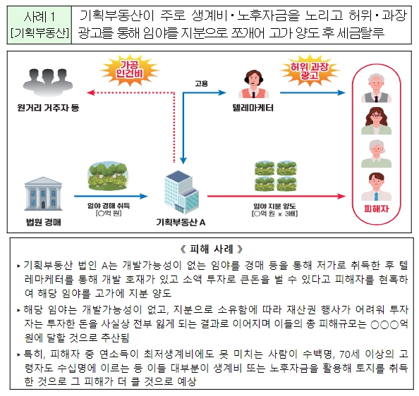 특히, 은퇴계층의 노후자금을 노리고 소액 투자를 유도하는 기획부동산 사기가 지속적으로 발생하고 있고, 주거 낙후지역 재개발을 방해하는 알박기 투기 후 관련 세금을 탈루하는 행태도 계속되고 있다.