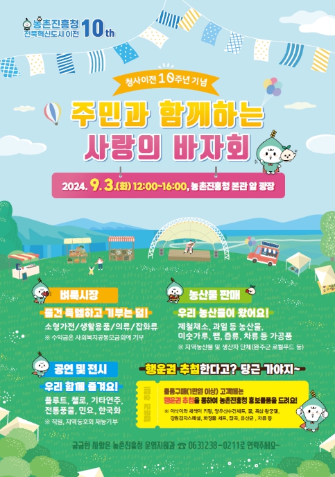 [뉴스서울] 농촌진흥청은 전북혁신도시 이전 10주년을 기념해 9월 3일 본청 본관 앞 광장에서 ‘주민과 함께하는 사랑의 바자회’를 연다. 농촌진흥청은 지난 2014년 7월, 52년간의 경기 수원 시대를 마감하고 전북혁신도시로 이전해 올해로 10년째를 맞고 있다.