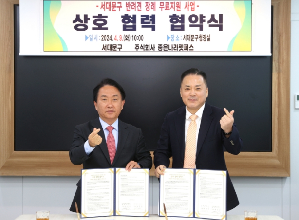 [뉴스서울] 서울시 서대문구는 최근 ㈜좋은나라펫피스와 구민 대상 ‘반려견 장례 무료 지원 사업’을 위한 업무협약을 맺었다고 11일 밝혔다.