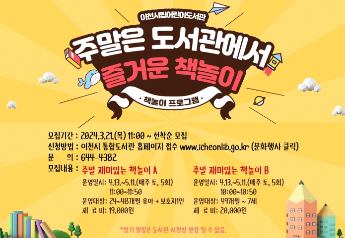 한편 이천시장은 “이번 프로그램을 통해 아이와 부모 간의 친밀감을 형성하고 유대감을 높이며, 책과 함께 행복하게 성장할 수 있는 시간이 되기를 바란다”라고 전했다.