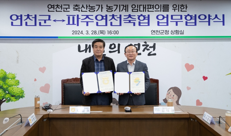 [뉴스서울] 연천군은 28일 군청 상황실에서 김덕현 군수, 이철호 파주연천축협조합장 등이 참석한 가운데 축산농가의 농업기계 임대편의를 위한 업무협약을 체결했다.
