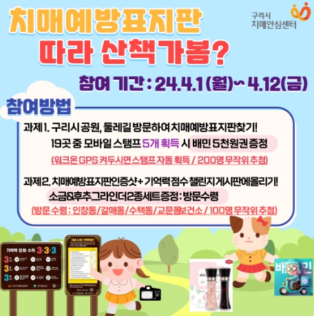 [뉴스서울] 구리시는 치매 예방을 위해 전 시민을 대상으로 오는 4월 1일부터 4월 12일까지 2주간 ‘치매예방표지판 따라 산책가봄?’걷기 스탬프 투어 챌린지를 운영한다.