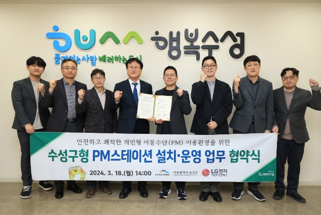 [뉴스서울] 대구 수성구는 18일 LG전자 사내 독립기업인 커런트닷컴퍼니와 PM(개인형 이동수단) 스테이션 설치를 위한 업무협약을 대구시 최초로 체결했다.