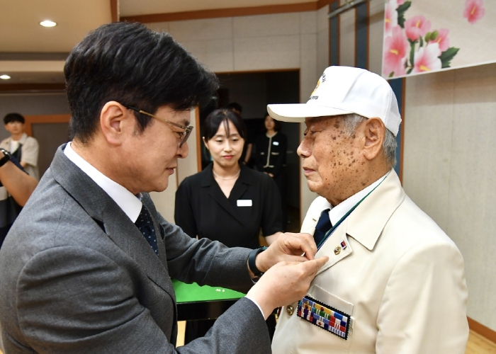 이어진 ‘끝까지 찾아야 할 태극기 배지’ 달기 행사에서 김병수 시장은 UN산하 8240부대 소속으로 참전하신 신재천용사, 육군 제1군단 소속으로 참전하신 김응선용사, 육군 6사단소속으로 참전하신 최성구용사, 간호장교로 참전하신 오세진용사, 치안국 기동대소속으로 참전하신 이준영용사 다섯분께 직접 달아드리며 감사와 존경을 표했다.