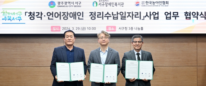 [뉴스서울] 광주광역시 서구가 29일 서구장애인복지관, (사)한국농아인협회 광주광역시 서구지회와 청각·언어장애인 정리수납 일자리 사업 업무협약을 체결했다.