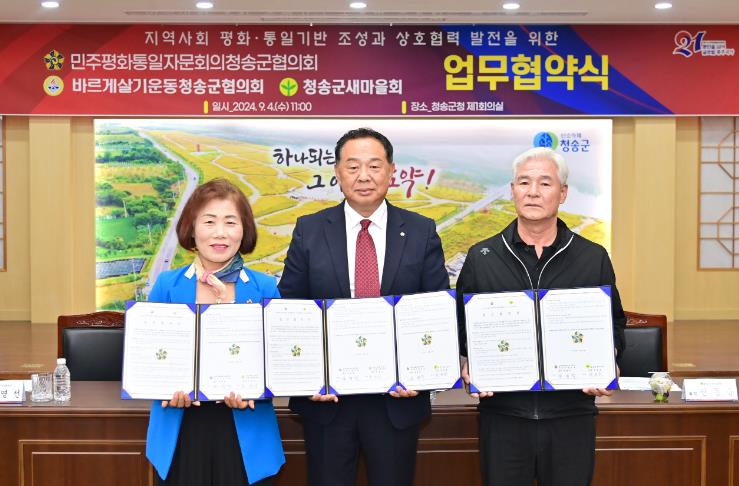 [뉴스서울] 민주평화통일자문회의 청송군협의회는 지난 4일 군청 제1회의실에서 바르게살기운동 청송군협의회, 청송군새마을회와 ‘상호 협력 발전’을 위한 업무협약 체결식을 개최했다.