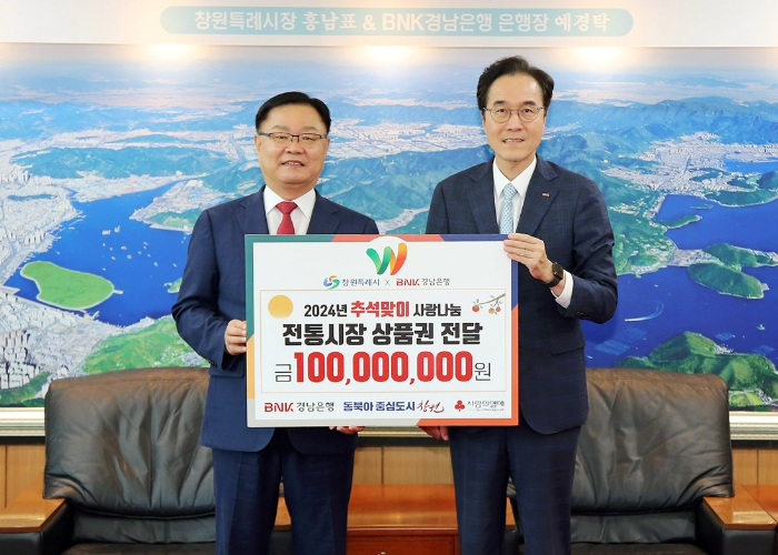 [뉴스서울] 창원특례시는 5일 BNK경남은행(은행장 예경탁)에서 추석 명절을 맞아 어려운 이웃을 돕기 위해 온누리 상품권 1억 원을 기부했다고 밝혔다.
