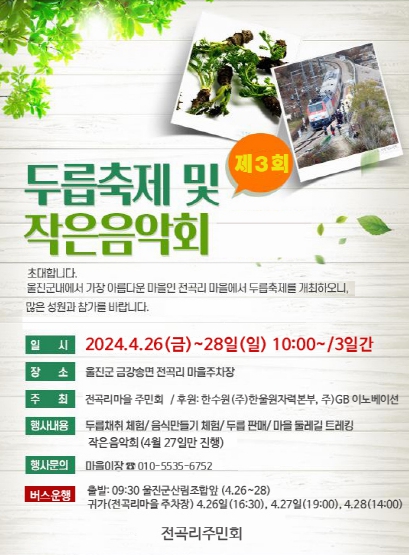 [뉴스서울] 울진군은 26일부터 28일까지 3일간 금강송면 전곡리에서 봄맞이 두릅 축제 및 작은 음악회를 개최한다고 밝혔다.