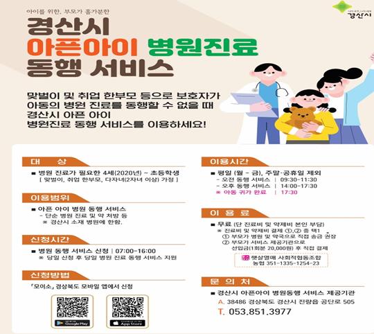 [뉴스서울] 경산시는 9월부터 맞벌이 가정, 취업한부모, 다자녀 가정 등 자녀와 병원 동행이 어려운 양육자를 위해 ‘아픈아이 병원진료동행서비스’를 시범 운영한다고 31일 밝혔다.