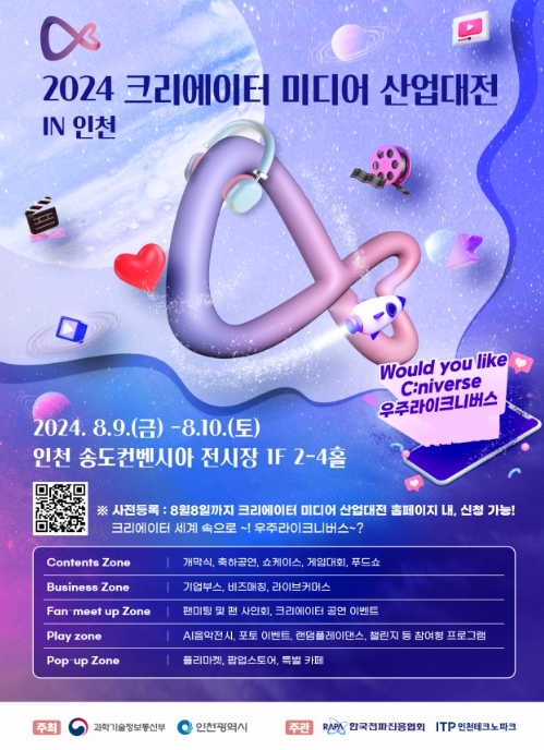 [뉴스서울] 과학기술정보통신부는 국내 창작자 미디어 산업의 대표 행사인'2024 크리에이터 미디어 산업대전 in 인천'을 8월 9일~10일 이틀간 인천 송도컨벤시아에서 개최한다.