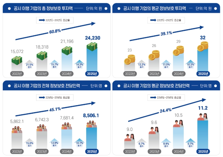 2025년 정보보호 공시 기업의 정보보호 총 투자액은 약 2조 4,230억원으로 전년대비 14.3% 증가, 총 전담인력은 약 8,506명으로 전년대비 10.7% 증가