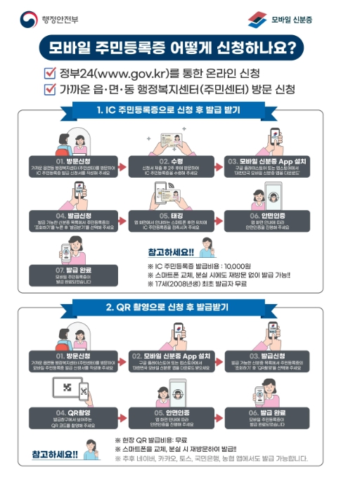 모바일 주민등록증 발급 방식은 2가지이다. IC 주민등록증을 이용해 모바일 신분증을 받는 방식과, IC 주민등록증 없이 스마트폰으로 QR을 촬영해 발급받는 방식이 있다.