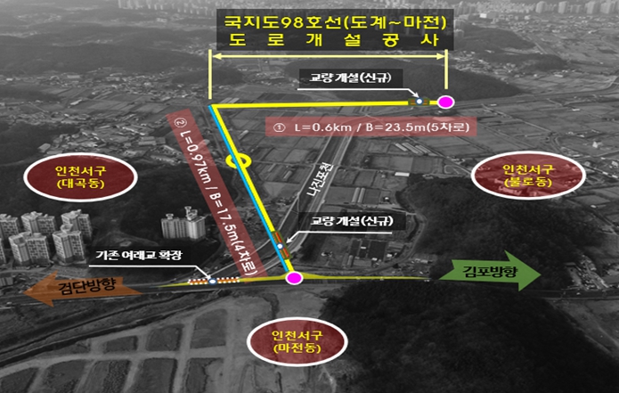 시 종합건설본부에서 공사 중인 국지도 98호선(도계 부터 마전) 도로개설사업은 사업비 479억 원을 들여 서구 대곡동에서 불로동 일원 1.57km의 4~5차선 도로를 개설하는 사업이다.