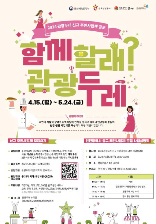 [뉴스서울] 인천시 중구는 한국관광공사 주관 ‘2024년 관광두레’에 참여할 신규 주민사업체를 모집한다고 1일 밝혔다.