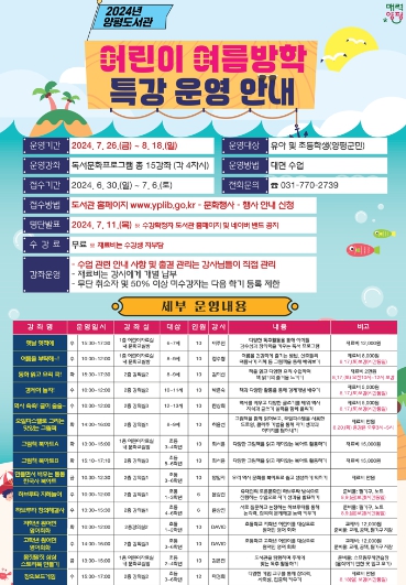 교육 기간은 7월 26일 금요일부터 8월 18일 일요일까지이며, 교육 신청은 양평군립도서관 홈페이지에서 선착순으로 접수할 수 있다. 양평도서관 여름방학 특강에 대한 보다 더 자세한 정보는 도서관 홈페이지 행사 안내란에서 확인하면 된다.
