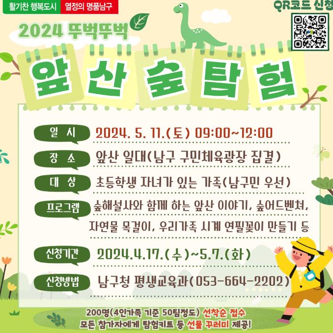 남구청은 작년에 이어 올해 봄에도 '2024년 봄, 뚜벅뚜벅 앞산 숲 탐험'을 개최하여 남구의 명소 앞산에서 숲과 자연을 탐험할 수 있는 가족 단위 숲 체험 프로그램을 통해 가족 간 소통과 화합을 도모하고자 사전 참가 신청을 받는다.