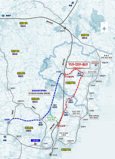 한편, '부산~양산~울산 광역철도'는 부산(노포)에서 월평을 거쳐 양산(웅상)을 경유해 울산(KTX역)까지 연결되는 광역철도다.