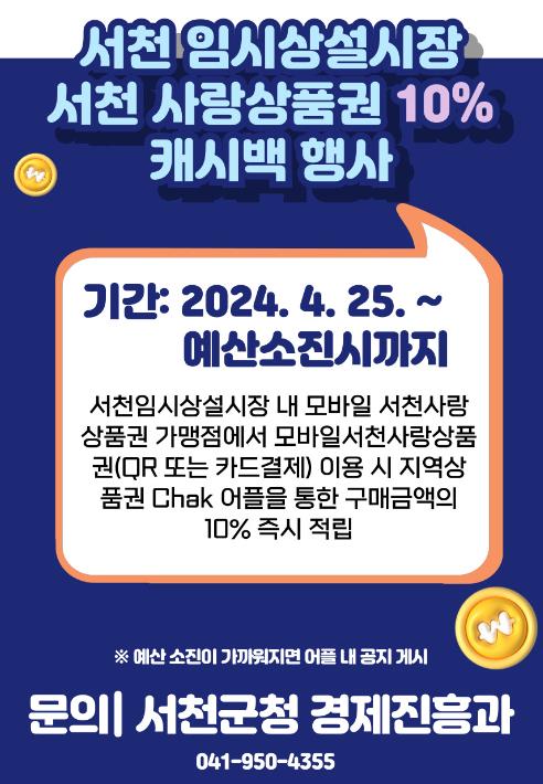 서천임시상설시장 내 서천사랑상품권 가맹점에서 모바일 서천사랑상품권(QR 및 카드 결제)으로 결제하면 즉시 10% 캐시백을 지역상품권Chak 어플에서 지급받을 수 있다.