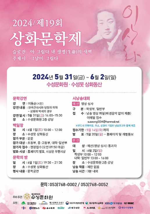 대구 수성구는 수성문화원이 주최·주관하는 ‘2024 제19회 상화문학제’가 오는 31일부터 내달 2일까지 3일간 수성문화원과 수성못 상화동산에서 열린다고 29일 밝혔다.