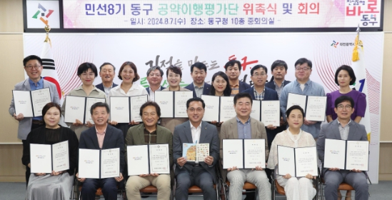 [뉴스서울] 대전 동구는 7일 구청 중회의실에서 민선 8기 구청장 공약사업의 효율적 추진 및 성실한 이행을 위해, 민선 8기 동구 ‘공약 이행평가단’ 13명을 위촉하고 1차 회의를 개최했다.
