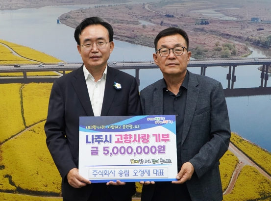 [뉴스서울] 전라남도 나주시는 ㈜송림 오정재 대표가 나주시 지역발전을 위해 고향사랑기부금 500만원을 기탁했다고 26일 밝혔다.