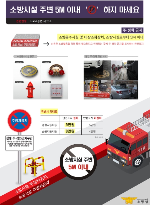 도로교통법 제32조(정차 및 주차의 금지)에 따라 소방용수시설 및 비상소화장치 등이 설치된 곳으로부터 5미터 이내인 곳에는 주·정차를 해서는 안 되며, 이를 위반할 경우 승용차는 8만 원, 승합자동차는 9만 원의 과태료가 부과된다.