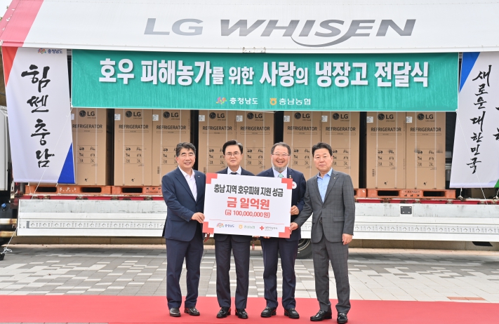[뉴스서울] 충남도는11일 도청 남문 다목적 광장에서 충남농협으로부터 호우 피해 복구를 위한 지정 기탁금 1억 원과 냉장고 1100대 등 총 6억 7000만 원 상당의 성금 및 물품을 전달받았다.