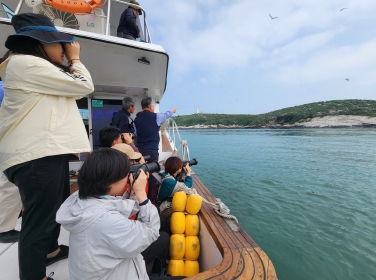 ▲ 21일, 일본 방문단이 바닷새 집단번식지인 불무기도를 해상에서 관찰하고 있다. |