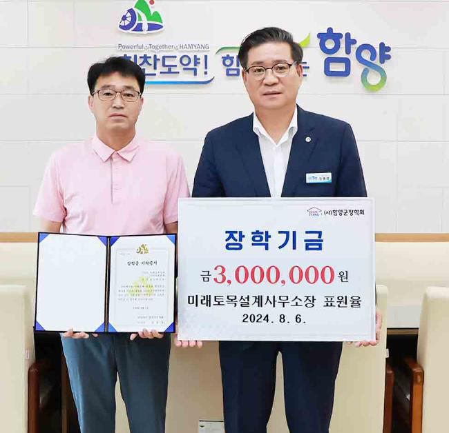 [뉴스서울] 함양군 지역 인재육성을 염원하는 기부 문화가 확산하고 있는 가운데 8월 6일 미래토목설계사무소 표원율 소장이 (사)함양군장학회에 장학금 300만 원을 기탁했다.