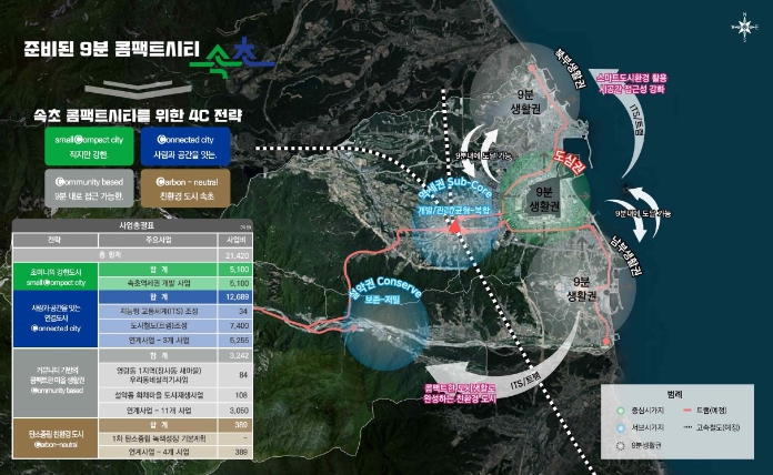 특히, △Small Compact city(초미니의 강한도시) △Connected city(사람과 공간을 잇는 연결도시) △Community based(커뮤니티 기반의 콤팩트한 마을생활권) △Carbon-neutral city(콤팩트한 도시생활로 완성하는 친환경 도시)를 주요 골자로 하는 4C 전략을 기본 바탕으로 속초형 콤팩트시티 전략을 시정 전반으로 확산시켜 나간다는 방침이다.