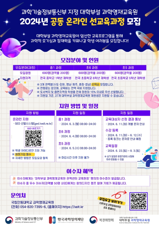 [뉴스서울] 과학기술정보통신부와 한국과학창의재단(이사장 조율래)은 오는 6월 3일부터 5일까지 전국 초‧중등 학생 대상 ‘2024년 대학부설 과학영재교육원 공동 온라인 선교육과정’ 수강생을 모집한다고 밝혔다.