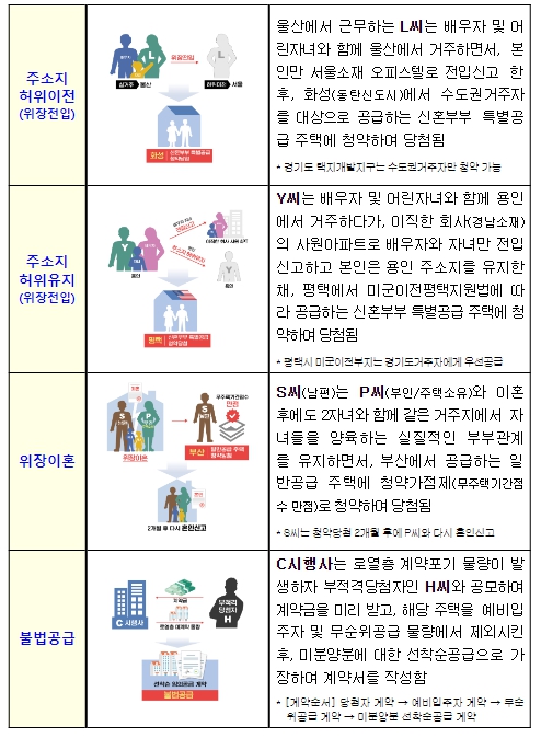 이번에 적발된 주택 공급질서 교란행위의 주요 유형은 다음과 같다.