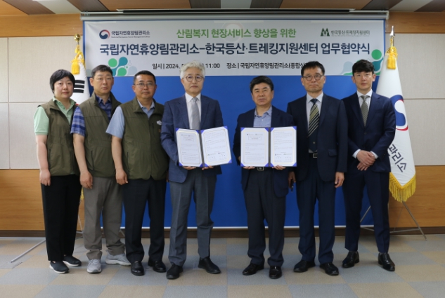 [뉴스서울] 산림청 국립자연휴양림관리소(소장 김명종)와 한국등산?트레킹지원센터(이사장 전범권)는 22일 대전시 서구 복수동 국립자연휴양림관리소 국립휴양종합상황실에서 건전한 등산·트레킹 문화확산을 통한 산림복지 현장서비스 향상을 위한 업무협약을 체결했다고 밝혔다.